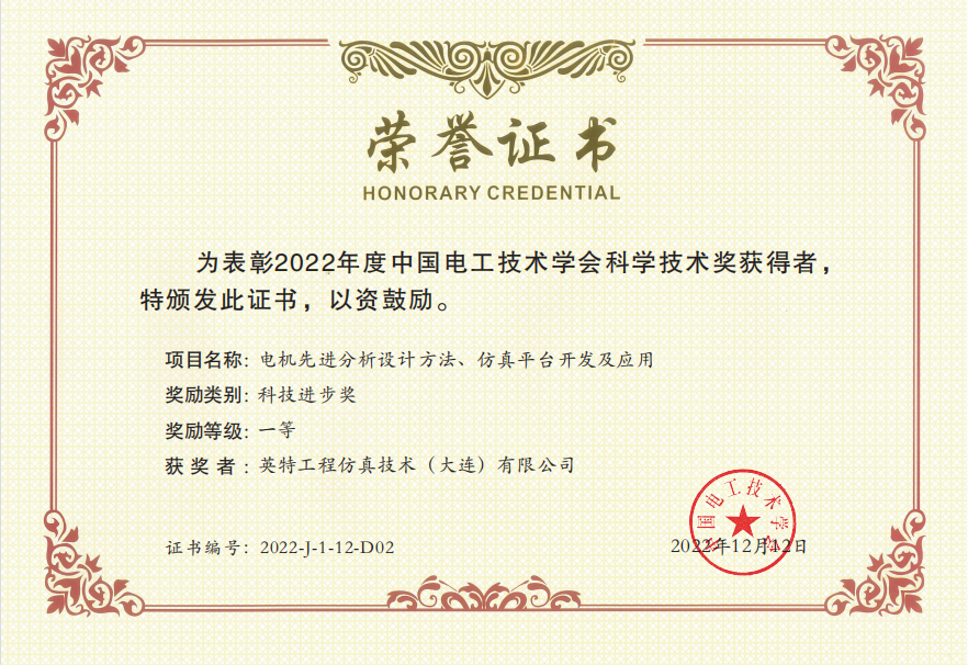 英特仿真榮獲2022年度中國電工技術學會科技進步一等獎